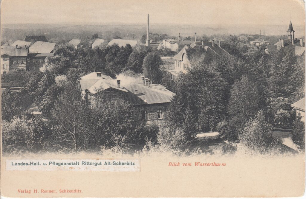In der Provinz Sachsen existierte in der Nähe schon die Anstalt in Halle-Nietleben, die aber an ihre Kapazitätsgrenzen stieß. Außerdem sollten die dort entwickelten Reformansätze der Verbindung von Behandlung und Arbeit in einer Art Musteranstalt umgesetzt werden. So wurde am 15.02.1876 das 288 Hektar große Rittergut Altscherbitz für 975.000 Mark angekauft. Der damalige Direktor der Anstalt in Nietleben, Professor Dr. Johannes Koeppe (1832-1879) übernahm daraufhin zusätzlich die Leitung der neuen Einrichtung in Altscherbitz. Am 28.06.1876 wurde der damalige Assistenzarzt Dr. Albrecht Paetz (1851-1922) mit zwei Männern und vier Frauen nach Altscherbitz geschickt, um Vorbereitungen für den Betrieb und die Aufnahme von Patienten zu treffen. Am 1. Juli 1876 konnten 39 Patienten in Begleitung eines Wärters und einer Wärterin von Nietleben nach Altscherbitz verlegt werden – zu diesem Zeitpunkt existierte nur das Gut mit seinen Nebengebäuden, alle anderen Anstaltsgebäude wurden erst in den Folgejahren errichtet.